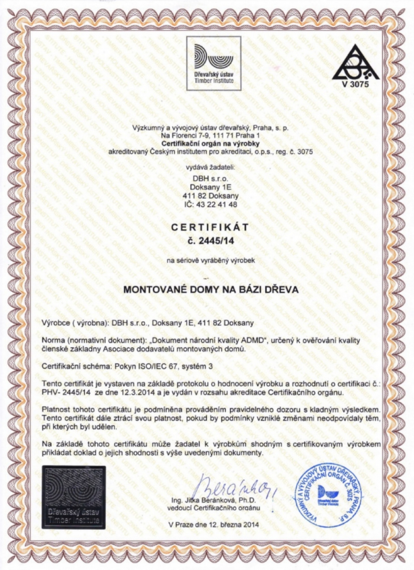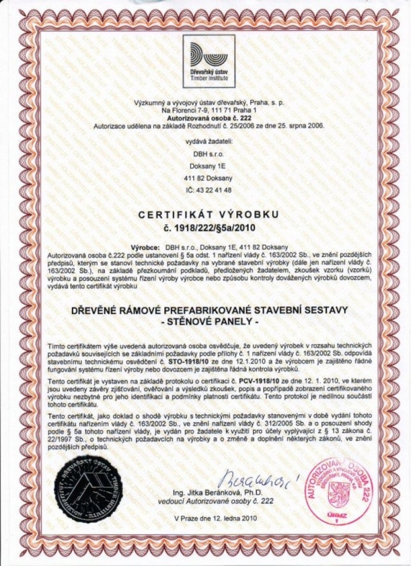 Výzkumný a vývojový ústav dřevařský vydal dne 1.10.2010 naší firmě DBH s.r.o. certifikát výrobku „Dřevěné rámové prefabrikované stavební sestavy - stěnové panely -“ neboli „Montované domy na bázi dřeva“ (dřevostavby). Každoročně probíhá audit ověřující zachování kvality certifikovaného výrobku. Proto se zákazník může spolehnout, že námi realizované dřevostavby splňují kvalitu, která je vyžadována Asociací dodavatelů montovaných domů.