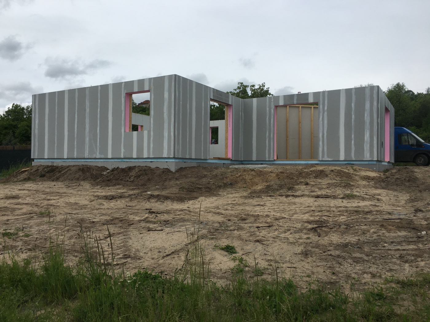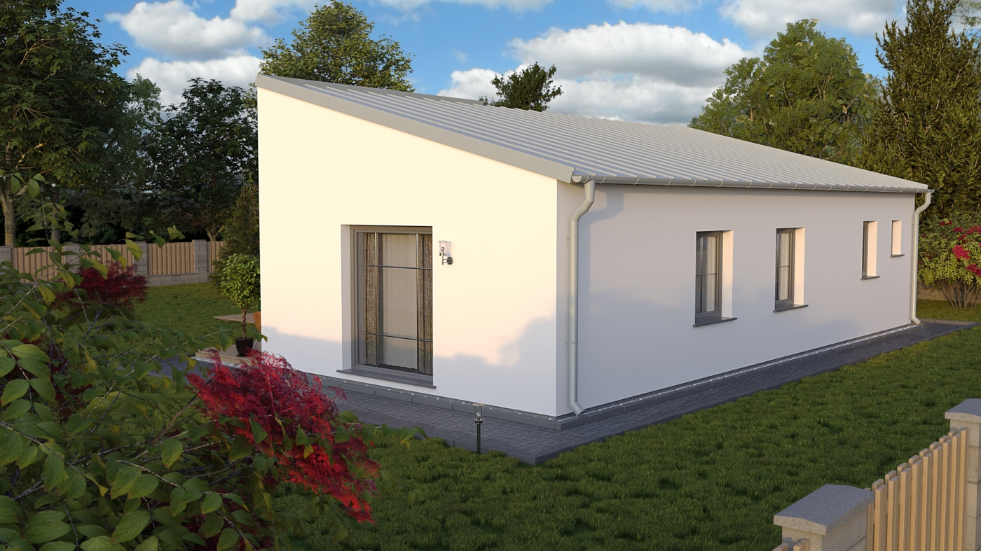 Tento moderní bungalov s netypickou střechou vyrostl na předměstí Mělníka. Zákaznice nejprve chtěla stavět větší dům, ale nakonec z osobních důvodů nechala projekt překreslit a dům, na který již bylo vyřízené stavební povolení se zmenšoval. Dům je členitý, uvnitř jsou prakticky dvě samostatné bytové jednotky, tak aby zákaznice a její dospívající syn měli každý svoje soukromí.