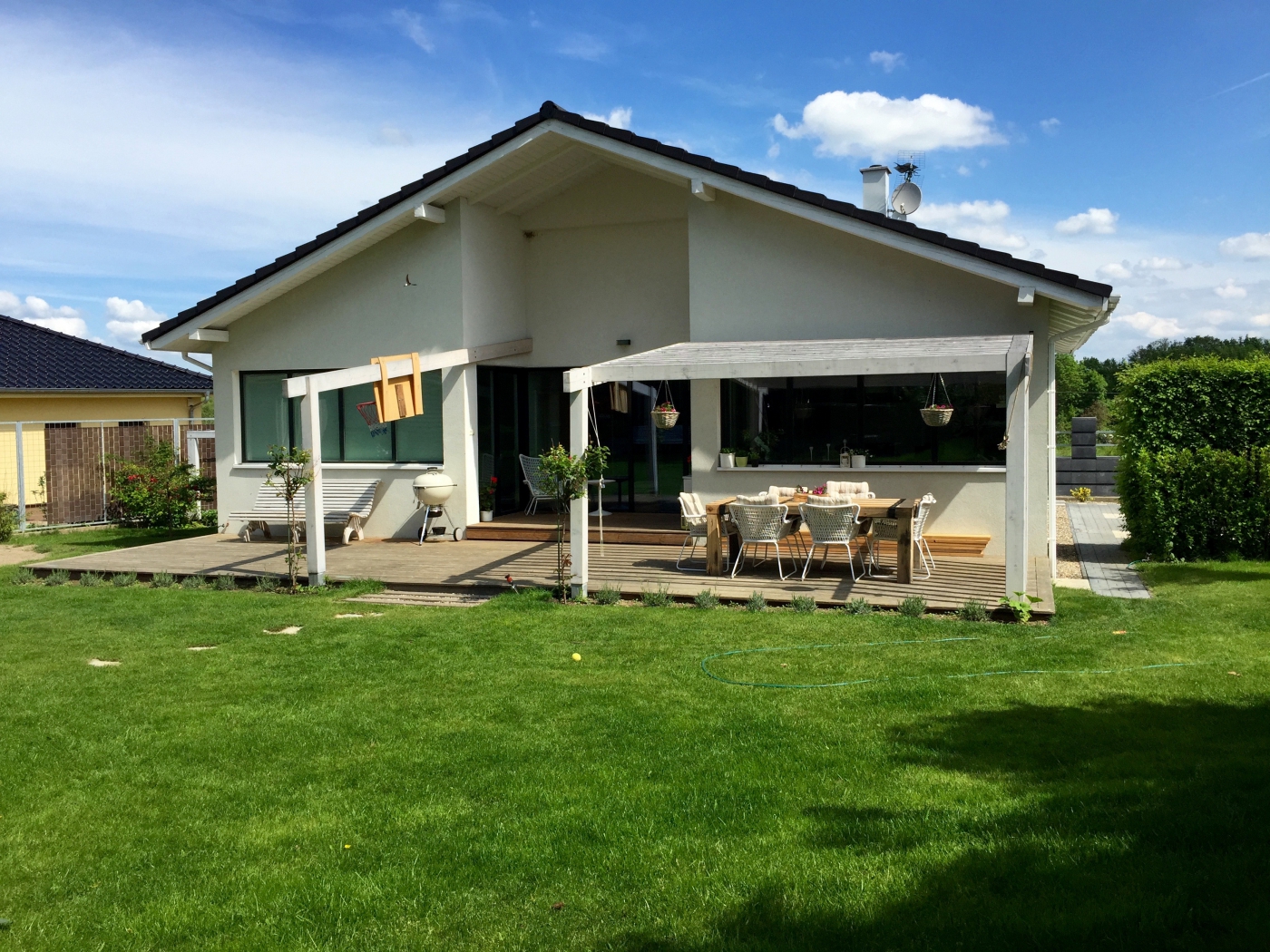 První dřevostavba postavená naší firmou v ČR ( od té doby realizovala dřevostavby ve Španělsku). Dům má prosklenou jižní část, bylo tedy třeba skleněné plochy odstínit pergolami. Ty v létě dům ochrání před přehříváním a v zimě, když je slunce nízko, nebrání pronikání slunce do interiéru a tím pádem tepelným ziskům. Dům byl koncipován jako bungalov, ale při výstavbě vznikl v II. NP mezonet, který slouží jako herna pro děti.