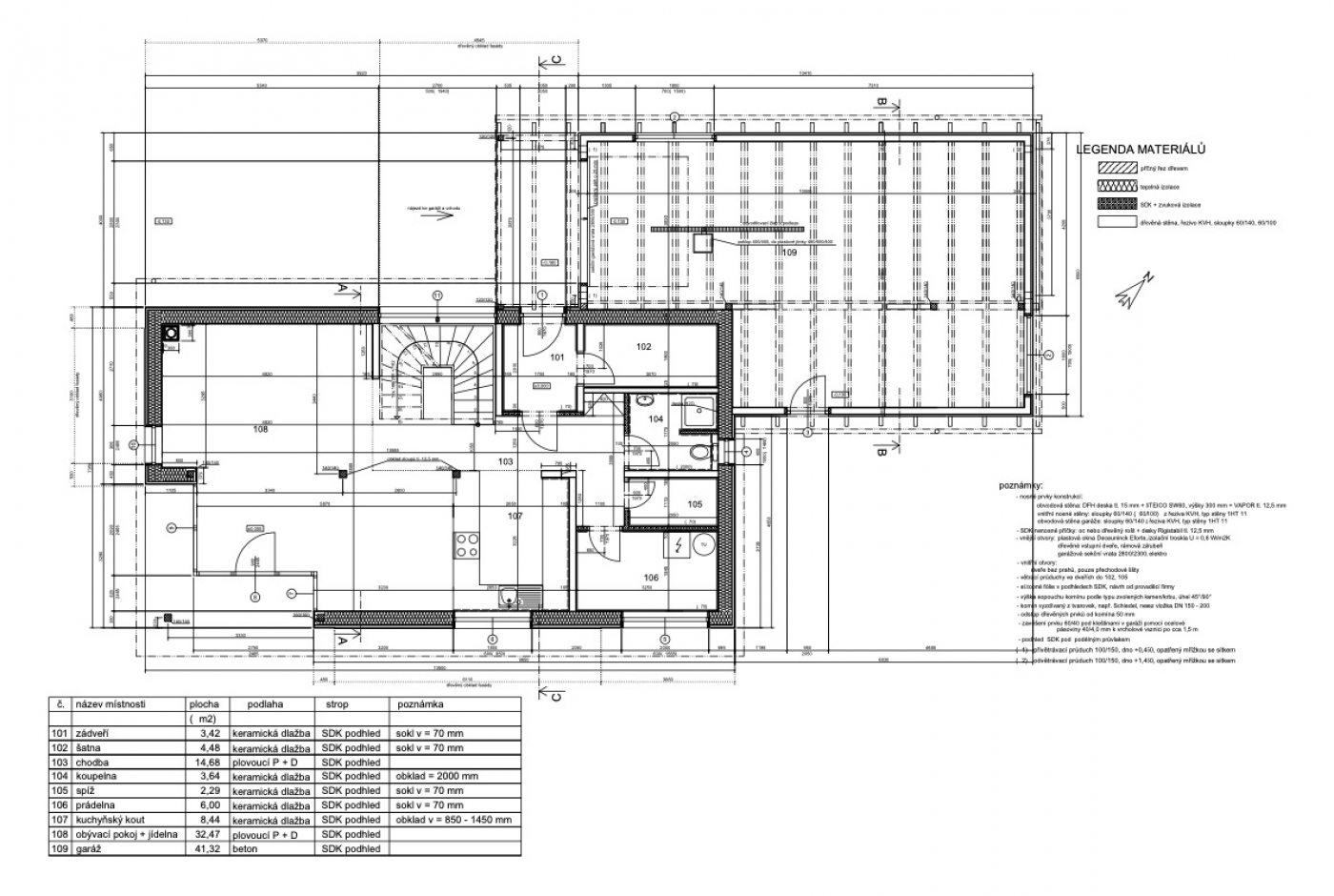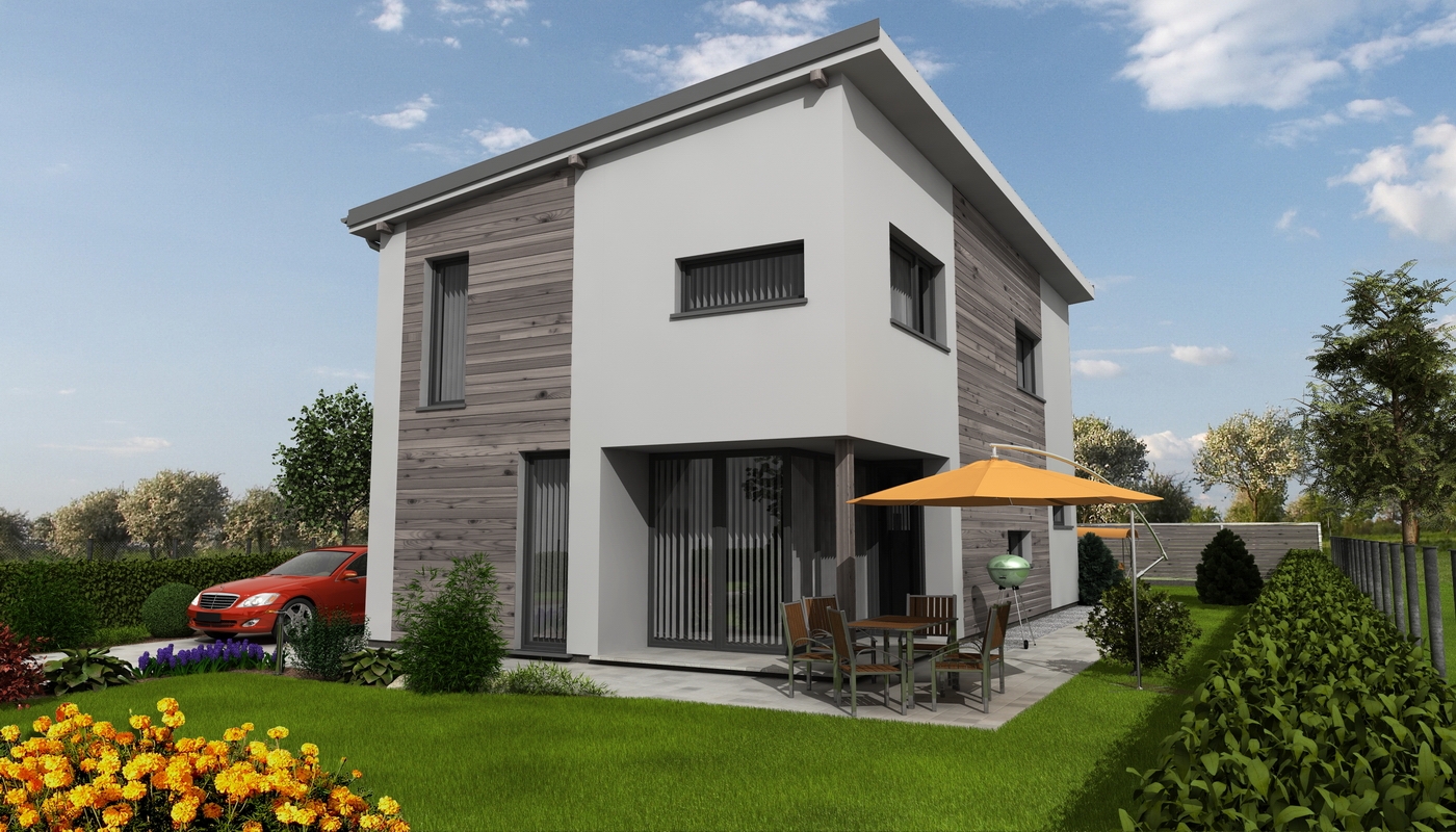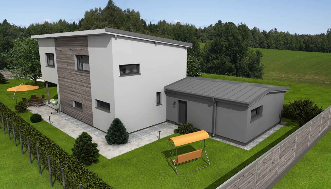 Dvoupatrová dřevostavba v moderním stylu má atypický vzhled a na konstrukční řešení náročný prosklený roh do hlavní obývací části. Zákazníci si potrpí na čistý a jednoduchý design. Objednávalo se např. kovové schodiště na míru, které tvoří jeden z výrazných prvků prvního podlaží. Moderní vzhled dřevostavby zvenku určuje pultová střecha. Dřevostavba má fasádu v kombinaci s dřevoobkladem. Na dřevostavbu pak navazuje prostorná garáž, kterou si zákazníci přáli zároveň používat jako malou dílnu, část garáže je tedy oddělená zateplená a je do ní přivedena voda.